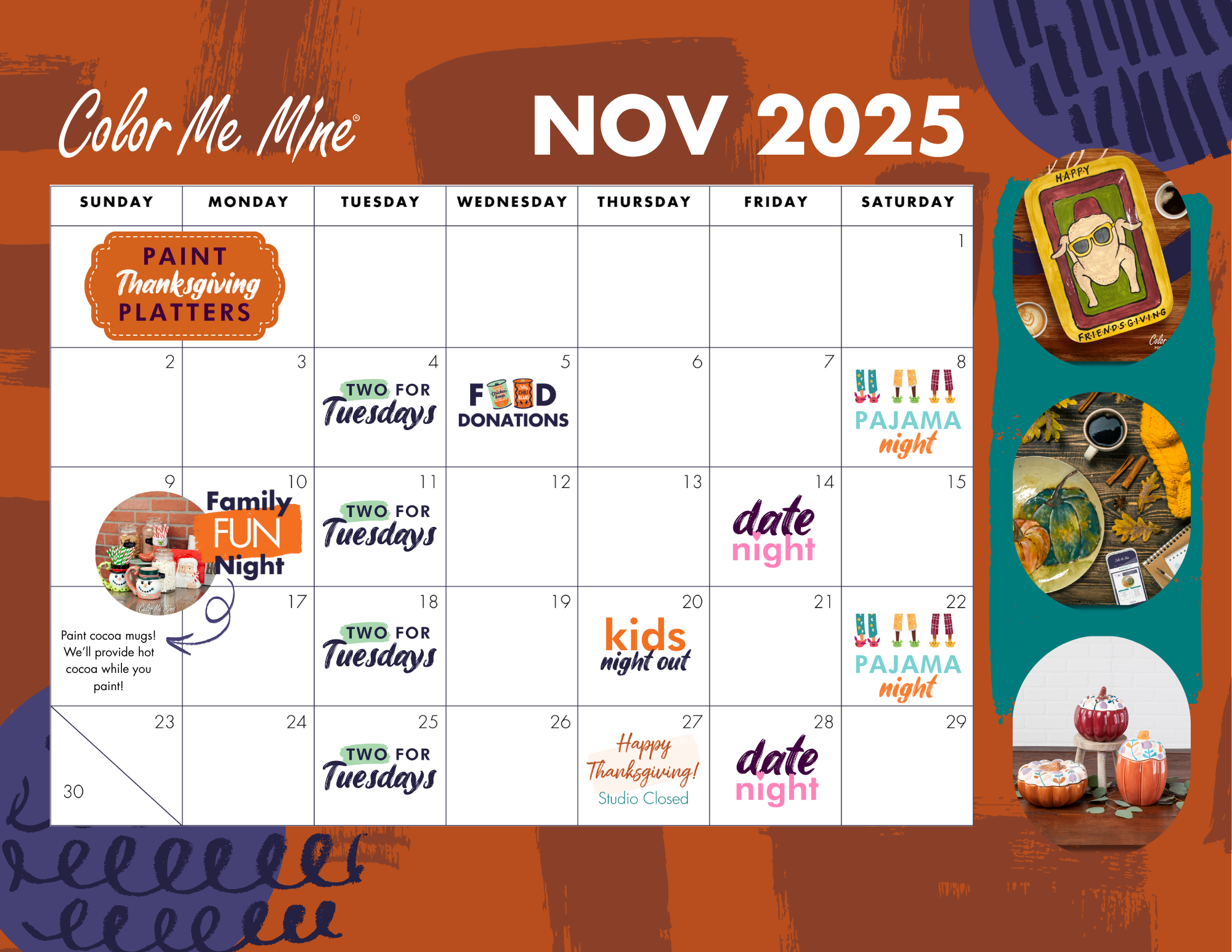 - Date Night: every other Friday night, enjoy 1/2 priced studio fees from 5pm - 9pm
