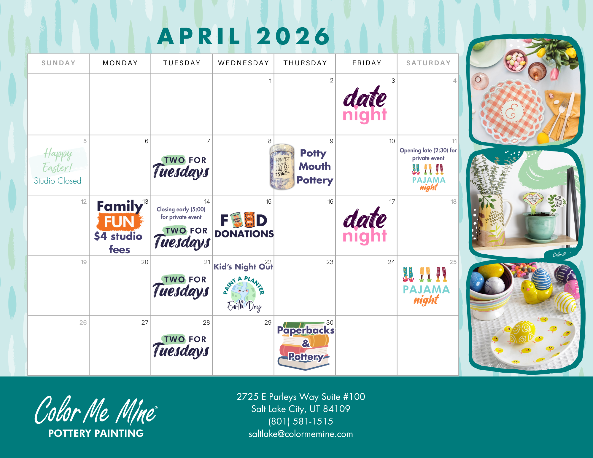 - Family Fun Day: on select days, $4 studio fees all day long